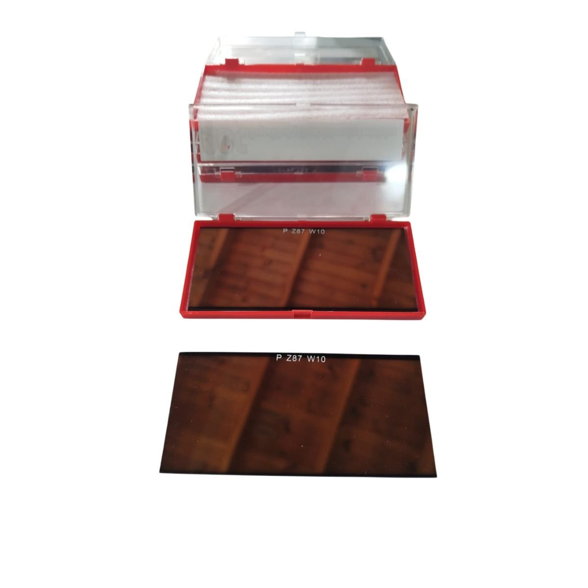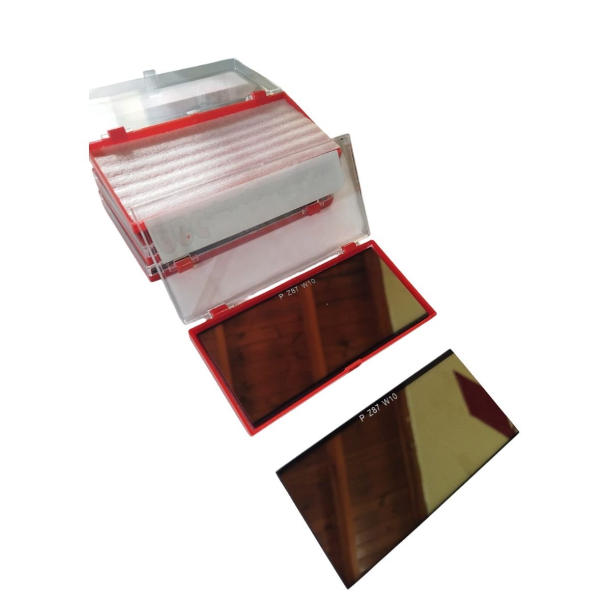 Vidrio individual empacado en sobre protector o cartón.